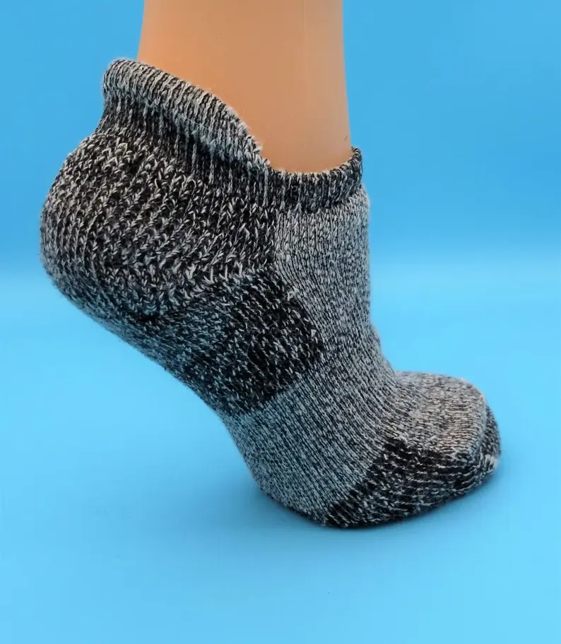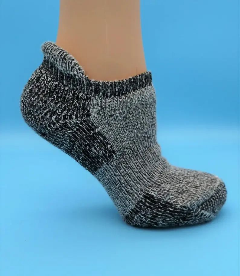 Back in stock with the new and improved Low Pro Alpaca Sock!!. This low profile design has alpaca terry loops through the entire sock for cushion, comfort, and maximum moisture wicking. There is a heel tab to keep the sock in place and prevent rubbing (great idea!). The arch band wraps around the entire sock for a proper fit and the heel and toe have been reinforced with nylon for increased durability. Hypo-allergenic, un-dyed, and naturally odor-resistant.