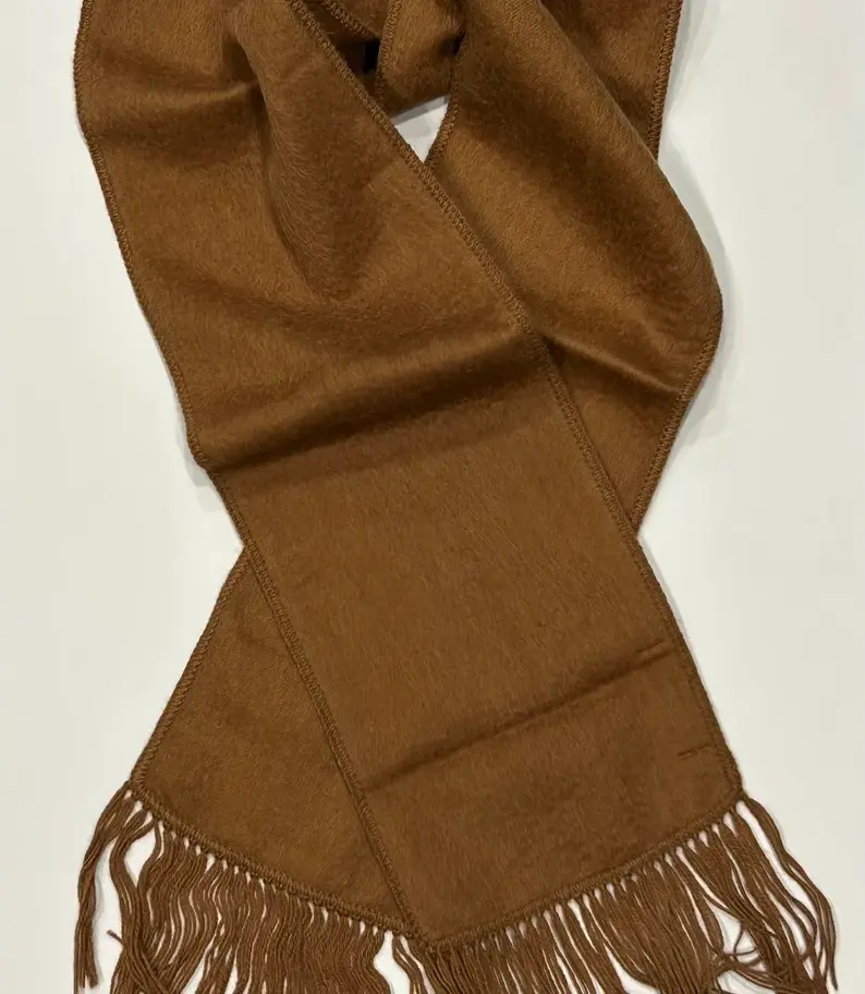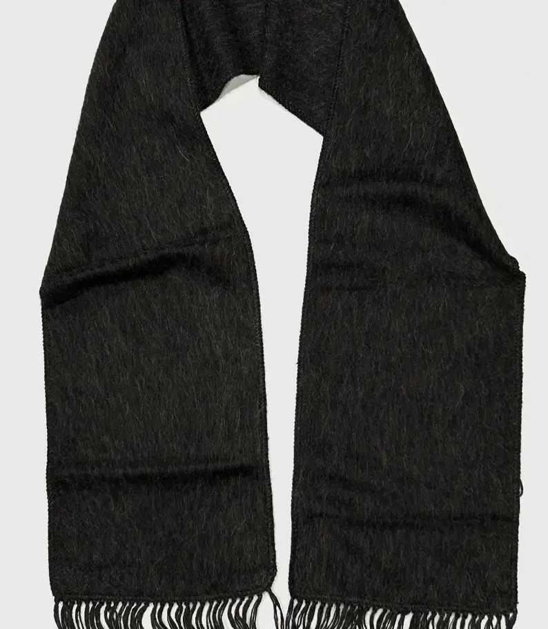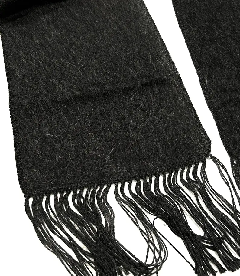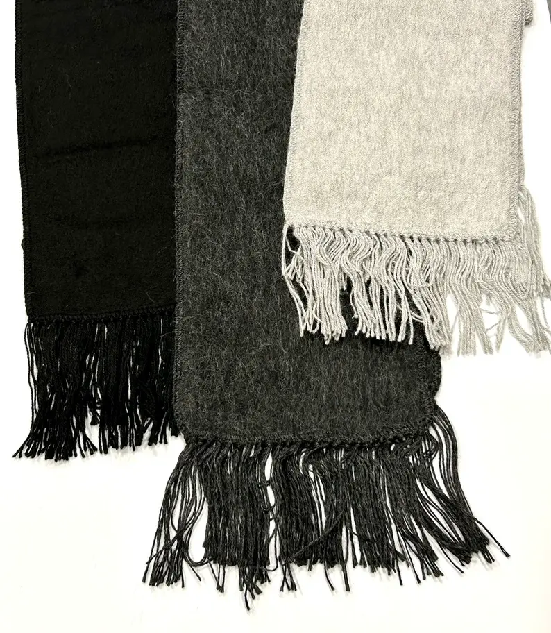 I call these the “Brushed Fiber Alpaca Scarf” because of how they look. The scarves are made up of longer pieces of fiber that appear to have been brushed into the product. You will notice this immediately when you see them in person. This brushed fiber characteristic is yet another way these scarves have become as soft as they are. The scarves at 8.5” wide and 68” long with 5” of fringes on each end.